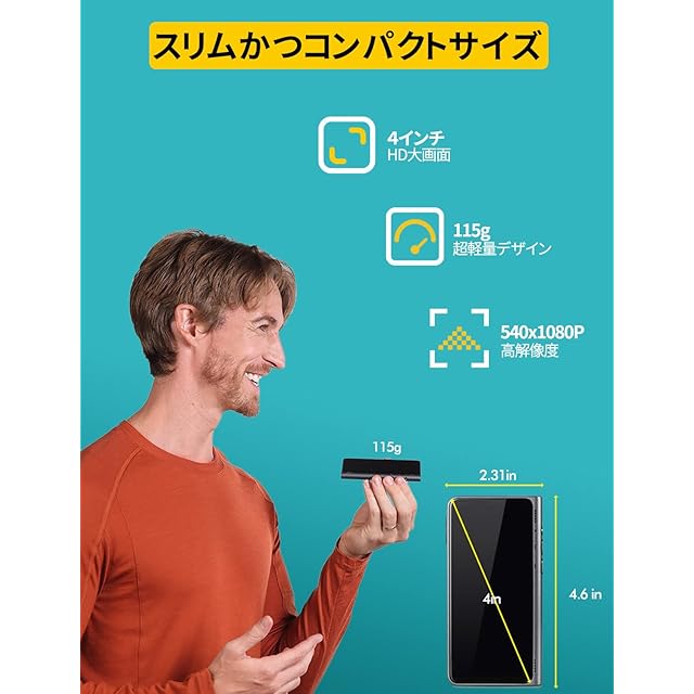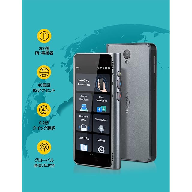 4インチ大型ディスプレイx超軽量:T1は従来の音声通訳機より大きさが1.5倍、4インチの大型ディスプレイに高解像度540x1080P採用で、画面の文字が断然見やすくなりました。さらにクレジットカード程度のコンパクト設計、わずか115gの超軽量を実現。旅行先でもポケットに入れて気軽に持ち運べる頼れる携帯翻訳機です。