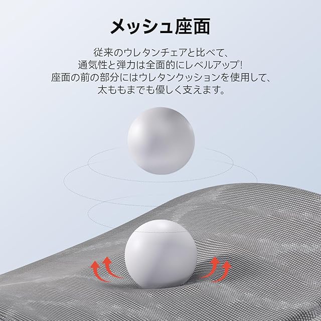 「高性能メッシュ材料&床にキズが付きにくい静音キャスター」オフィスチェアの座面は高性能のメッシュで通気性強い、さらに、お尻の曲線に応じてデザインされており、お尻や太ももを優しく包み込み、体圧をより良く分散することで、長時間座ってもお尻が痛く感じられません。オフィスチェアは静音PUキャスターを採用して、移動音が静かで床にキズが付きにくいです。