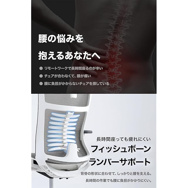 【 人間工学 に基づいた背面設計】背骨の形状に沿って腰を支えるフィッシュボーン ランバーサポート 採用。三段階調節可能。背骨の形状に合わせて 腰 をしっかりと支える。背骨に痛みを感じやすい方は”ランバークッション”を装着することで更に快適にご使用いただけます。