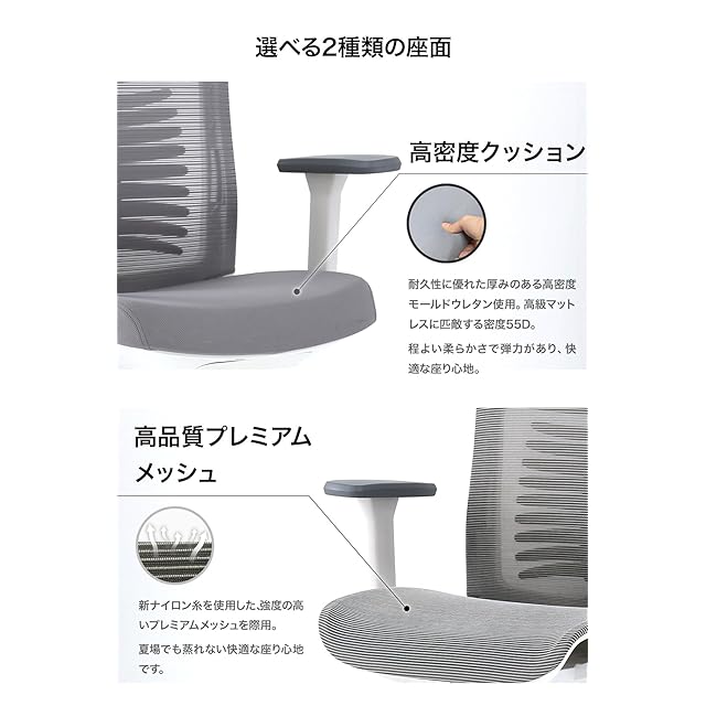 【蒸れにくく快適な座り心地】新ナイロン糸を使用した強度の高いプレミアムメッシュを採用、夏場でも蒸れない快適な座り心地。人間工学に基づいたS字形状の背もたれ、頭をベストポジションで支える2Dヘッドレストにより快適で疲れにくい姿勢を長時間キープ
