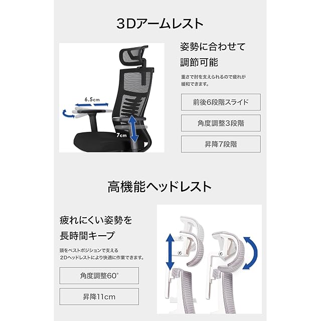【充実した多機能性】①「リクライニング最大約132度」長時間のデスクワークや勉強で疲れた際には リクライニング で一休み。リクライニング最大約132度、4カ所固定可能。②「3Dアームレスト」昇降7㎝(7段階)、3段階の角度調節(左、正面、右)、前後スライド幅6.5㎝(6段階スライド)。アームレストを使うと、 デスクワーク や ゲーム などで手にかかる重さをひじで支えられ、疲れが緩和。 ③「2Dヘッドレスト」昇降11㎝、角度調節幅60度まで調節可能。