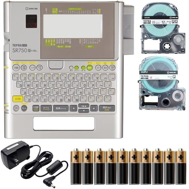 キングジム ラベルライター 「テプラ」PRO SR750 & テープカートリッジ(白ラベル SS12K+試用ラベル1本付属) & アルカリ乾電池 (3点セット)