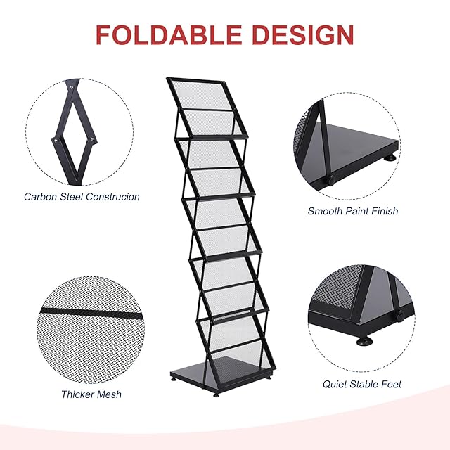 折りたたみ式ラック:この雑誌ディスプレイラックの折りたたみ式デザインにより、数秒でディスプレイスタンドを展開したり保管したりすることができ、工具は必要ありません。折りたたみサイズ(45 x 37 x 17cm)、展開サイズ(166 x 45 x 37cm)。