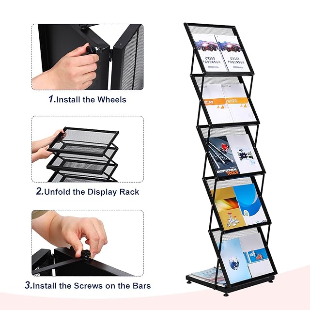 使いやすさ:この雑誌ディスプレイラックは取り付けが簡単で、最適な表示のための完璧な角度が特徴です。雑誌、パンフレット、カタログ、印刷物に最適です。