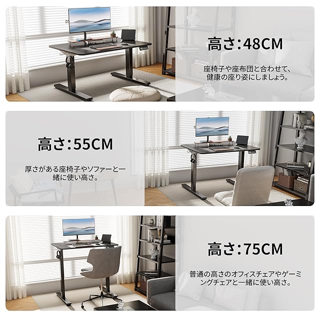 【日本人に合った電動昇降式ローデスク】普段の生活習慣に合わせて、座椅子、レーシングシミュレーター、ソファ、ゲーミングデスク、ベッドなど、さまざまな座席に対応しています。デスクは静音設計で、昇降時の騒音は55デシベル以下と非常に静かです。夜間の利用でも、他人に迷惑をかける心配がなく、集中して作業や勉強ができます。