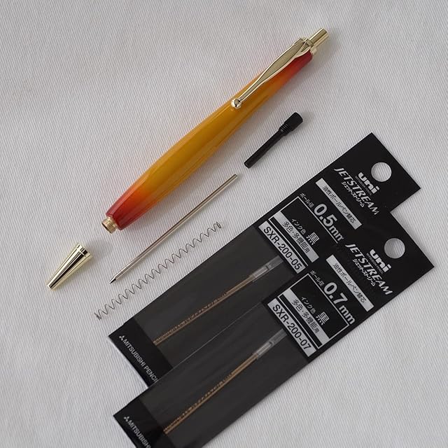 国内の伝統工芸作家、職人さんが、一本一本、丁寧に作り上げた一点物の「作品」。世界にひとつとして同じものはない、特別なボールペンです。初期はDAYACOM(ドイツ) 0.7mm・黒 を装填。替芯には、ジェットストリーム「SXR-200」をご利用いただけます。