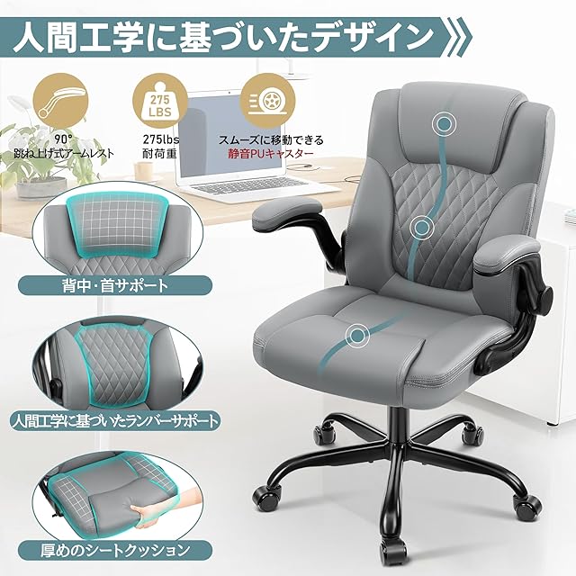 【高品質PUレザーと快適性】防水・汚れに強い人工皮革を使用した耐久性抜群のデスクチェア。高密度スポンジクッションで長時間座っても疲れにくく、本革のような高級感あるデザインがオフィスやゲーミングルームに最適です。
