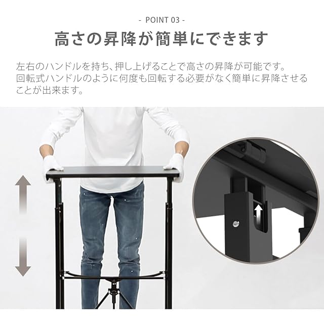 ✨【簡単に高さが変えられる】左右のハンドルでお好みの高さに8段階の昇降が可能です。左右にある取手を引き上げながら高さを調整します。高さ調節は一度最大まで上げた後、1段ずつ降ろすと簡単に行えます。