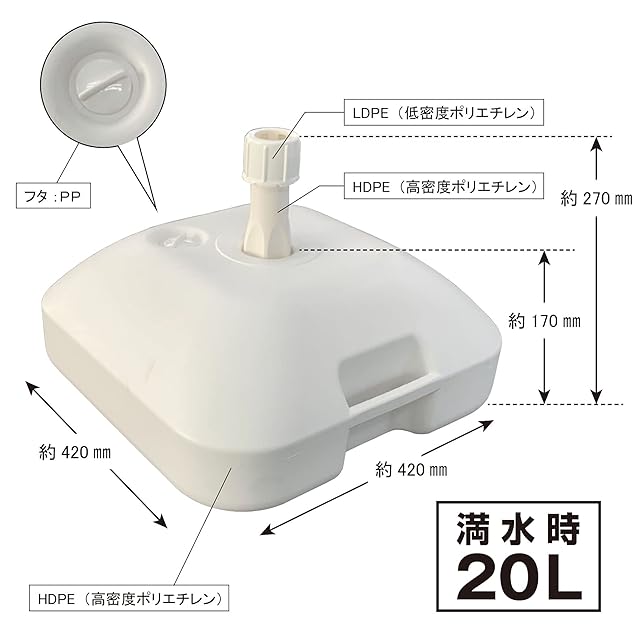 素材:本体HDPE(高密度ポリエチレン)、支柱LDPE(低密度ポリエチレン)+HDPE(高密度ポリエチレン)、蓋部‘PP
