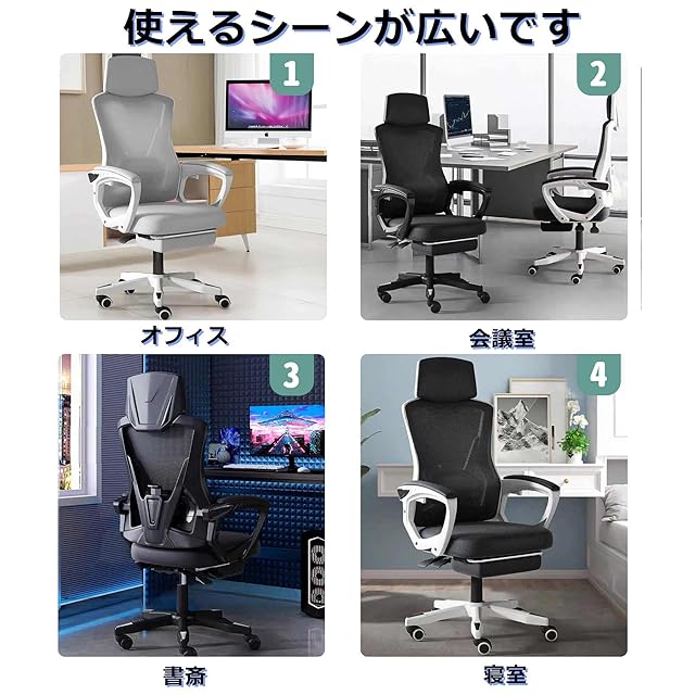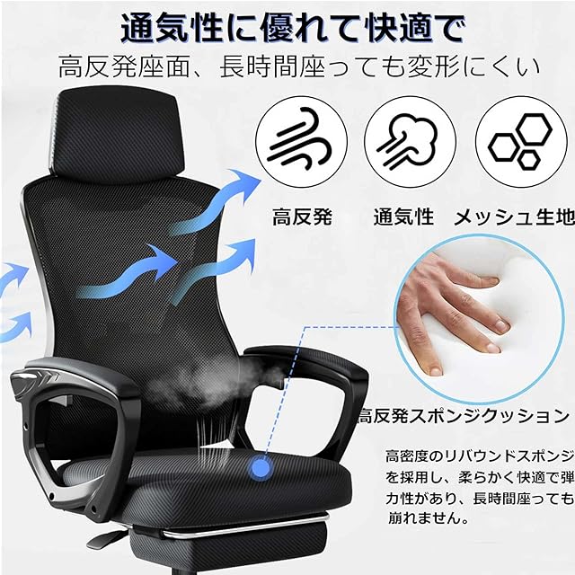 【フルメッシュで一年中快適】オフィスチェアの背もたれは競技用メッシュ素材を採用して、よりよい伸縮性があり、通気性に優れています。夏場や暖房の効いた冬場でも蒸れずに快適な座り心地を実現します。それに座面は高反発ウレタン素材を採用しており、心地よいクッション性があり、リラックス効果が抜群で、ソファのように包み込まれる快適な座り心地が体験できます。テレワーク用、勉強用、在宅ワーク用、様々な場合で活躍です。