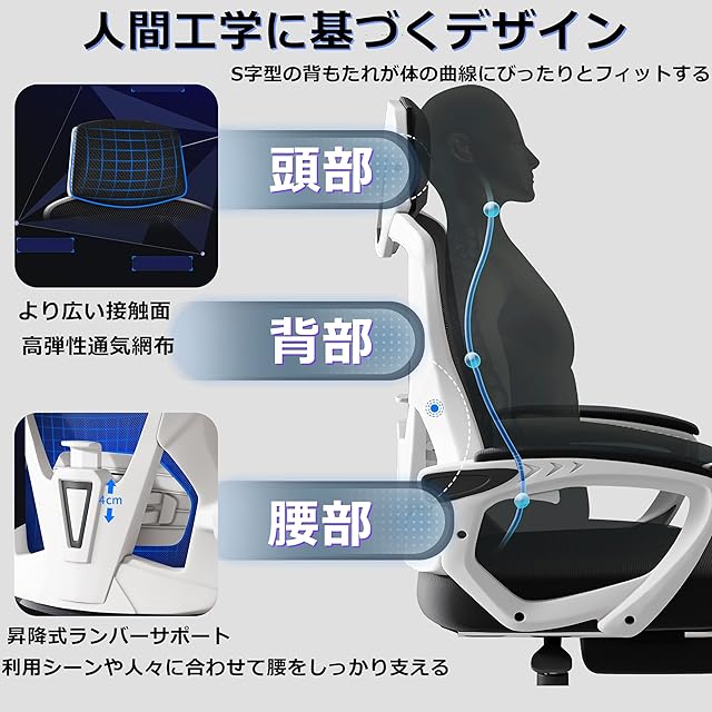 【人間工学に基づいたオフイスチェア】座面と背中、ヘッドレストが独立した設計のオフィスチェア。Supzmgの独自な構造により、「長時間座って作業しても疲れにくい工夫が施されたオフィスチェア」のことを目指して、人の背中のカーブに合う形状や腰への負担を減らす設計で、健康的な姿勢へ導きます。それに、収納可能なオットマン付きで、疲れたときは思い切り足を伸ばしてリラックスできます。