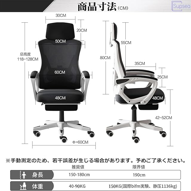 【簡単に組立可能・商品仕様】オフィスチェアのサイズ:幅60×奥行60×高さ118-128cm(座面高:42-50cm)。高さ調節が可能なので、小柄な女性にも座りやすいモデルとなります。また、本体重量は15kgですが、静止耐荷重は約150KGに達しており、ご安心して利用いただけます。組み立てには、道具も日本語説明書も付いていますから誰でも20分以内に八つのシンプルステップでこのオフィスチェアを組み立てることができます。
