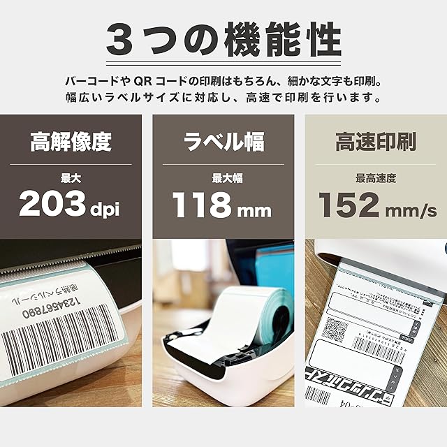【 あらゆる場面に対応 】 感熱紙の幅:32mm ~ 118mm 感熱紙の直径:127mm での印刷が可能。 ■FBA配送ラベル、郵便宛名、値札、食品表示、アドレス、ラッピング、DIYラベル、冷蔵庫収納、配送ラベル、整理収納、名前ラベル等 109mm未満に収まるラベルやレシートを印刷することができ、幅広いジャンルの印刷に対応。 納品作業や食品表示シールの作成、レシートなどにご活用いただけます。