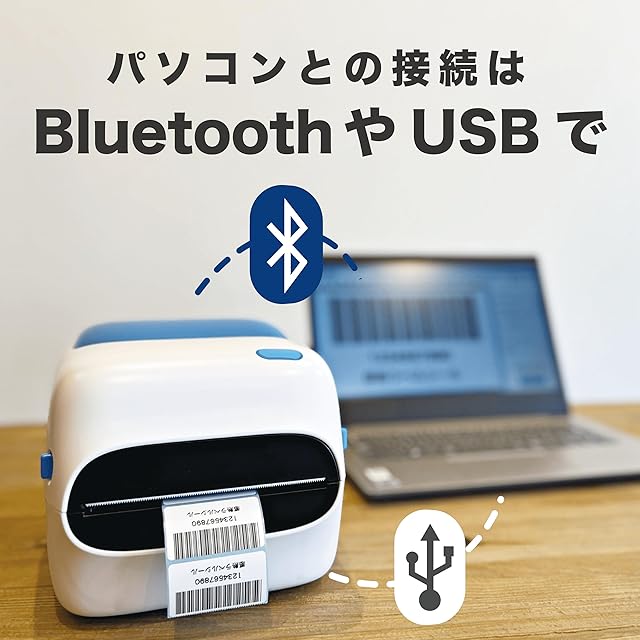 【 bluetooth接続で好きな場所から 】 USB接続はもちろん、Bluetoothによる接続で印刷をすることができます。 プリンターの近くにいる必要がないため、作業場から離れた場所からでも印刷したい方におすすめです。 また、プリンターの場所をPCに合わせて動かす必要もないためプリンターを固定の場所に設置いただけます。 USB接続にも対応。お手持ちのPCと接続することで印刷を円滑に行えます。 *Bluetoothの接続範囲のみ離れていても印刷できます。 *対応機器:Windows ( MAC OSはUSB接続のみ対応。))