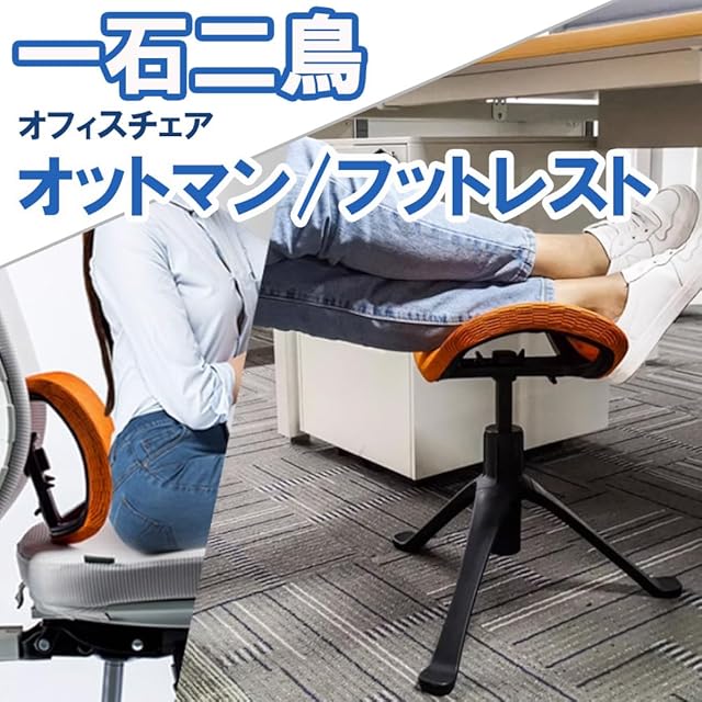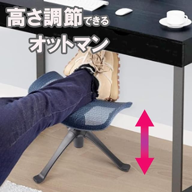 【高さ調整できるオットマン】会社や自宅のデスクチェアなどに合わせて足を置ける高さ調整機能付きオットマンです。