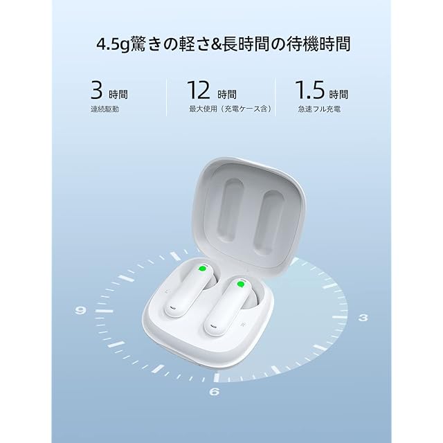 【ポータブル&クイック充電】イヤホン単体は3時間、充電ケースを合わせると最大12時間使用できます。1.5時間の急速フル充電にも対応(Type-C充電)。小型で軽量、持ち運びも楽々。耳への負担が少ないインイヤー式イヤホン、長時間使用しても疲れを感じにくい設計です。製品の充電には、必ず純正充電ケーブルを使用してください。 製品をしばらく使用した後、ヘッドセットの充電接点を清掃してください。
