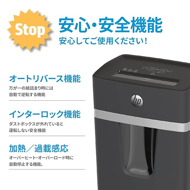 【使いやすさを追求したHPシュレッダー】スタイリッシュなデザインはSOHOやオフィスのデスクサイドにピッタリフィット!重要書類を手軽に2x15mmマイクロカットサイズに微細断処理できます。30分の長時間運転(当社従来品比約1.5倍)とオーバーヒート時からのリカバリーを20分(当社従来品比約1/3)に抑える事を可能にしたモーター冷却機能「エアクーリングシステム」と高性能モーターは騒音レベルを58dBに抑え、分かりやすい操作で誰にでも簡単に使えます。