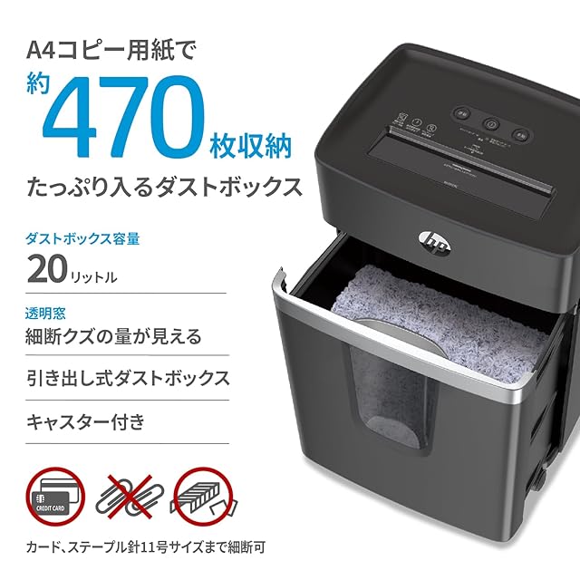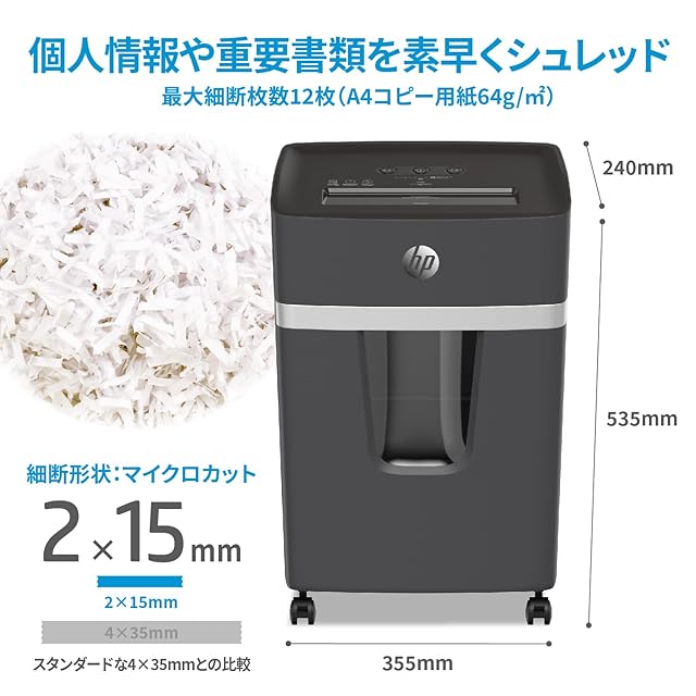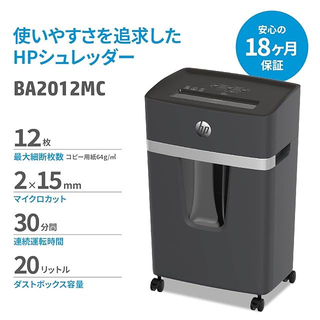 HP電動シュレッダー 業務用 家庭用(20L / 2-5人用) 静音 コンパクト / 微細断2x15㎜マイクロカット 12枚同時細断 / リモートワーク / 30分連続運転 / エアクーリングシステム/在宅勤務/オフィス/引き出し式大容量ダストボックス/省スペース/キャスター付き BA2012MC