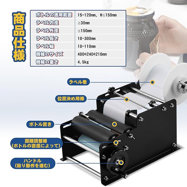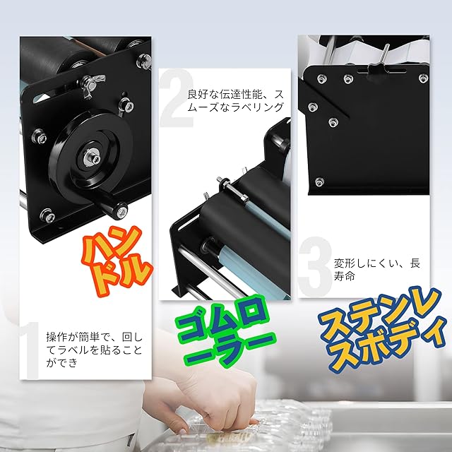 「操作簡単」熟練度により一分間に15-25本のラベル貼りが可能で、ハンドルを回すだけで作業できます。誰でも簡単に正確なラベルを貼ります。電動ではないので手作り感も楽しめます。