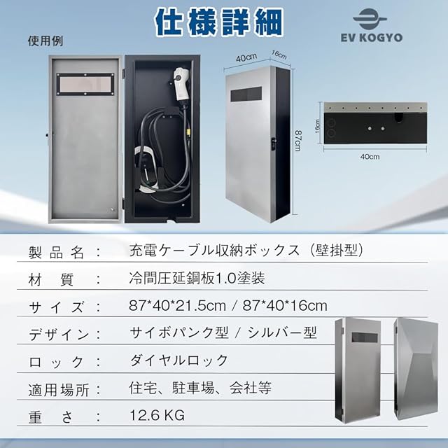 【製品仕様】充電ケーブル収納ボックス / 材質:冷間圧延鋼板スプレー塗装 / サイズ:87*40*21.5cm/87*40*16cm/ 色:シルバー&ブラック / ロック:メカニカルロック
