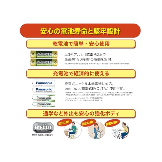 電源:3形アルカリ乾電池LR6(AM3)2本または単3形eneloop(エネループ)2本または単3形充電式EVOLTA(エボルタ)2本 、パソコンや別売USB-ACアダプターからのUSB給電