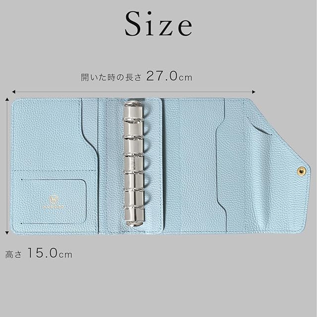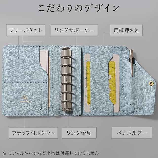 【こだわりの設計】 インデックスの使用時、はみ出しにくいサイズ感にしました。ペンホルダーに当たったり、曲がったり剥がれたりしにくい設計です。更に、リング跡を軽減するリングサポーターを採用し、美しい背表紙を維持する独自設計を施しています。携帯性と実用性を両立し、高級感と使いやすさを追求したおしゃれでシンプルなデザインとなっています。長く愛用できる耐久性の高い手帳カバーで、手に取るたびに気分が上がり、手帳時間が楽しくなります。あなただけの特別なスケジュール帳に。