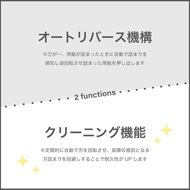 オートクリーニング機能搭載で定期的に詰まった紙を取り除いてくれます。手動機能もあり。修理の原因の一つにある紙詰まりによる動力部の不具合やギア破損などがありますが、これらのリスクを軽減します。