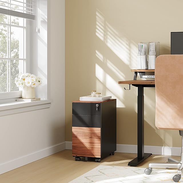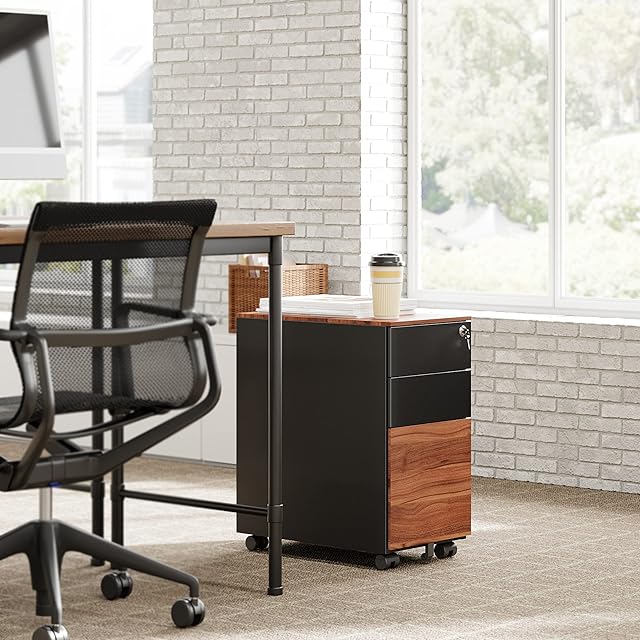 完成品 Fenge デスクワゴン スチール製 オフィスワゴン サイドワゴンキャビネット 袖机 キャスター付き 鍵付き 3段オールロック 大容量 A4対応FC303001MB