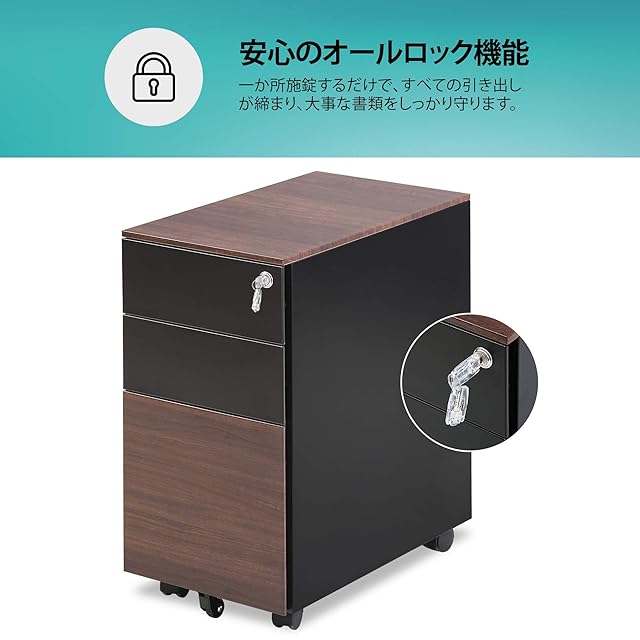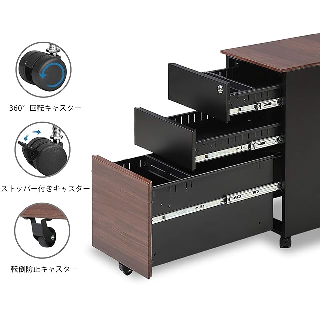【引き出し3段フルオープン】引き出しが3段付きで用途によって使い分けられ、ファイルを細かく分類できます。最上段目には、ペントレー付き、小さな文具が綺麗に収納できます。一番下の段目は、 オールロック付きなので、大切な書類や個人情報をしっかり守る、プライベートも安心感up。