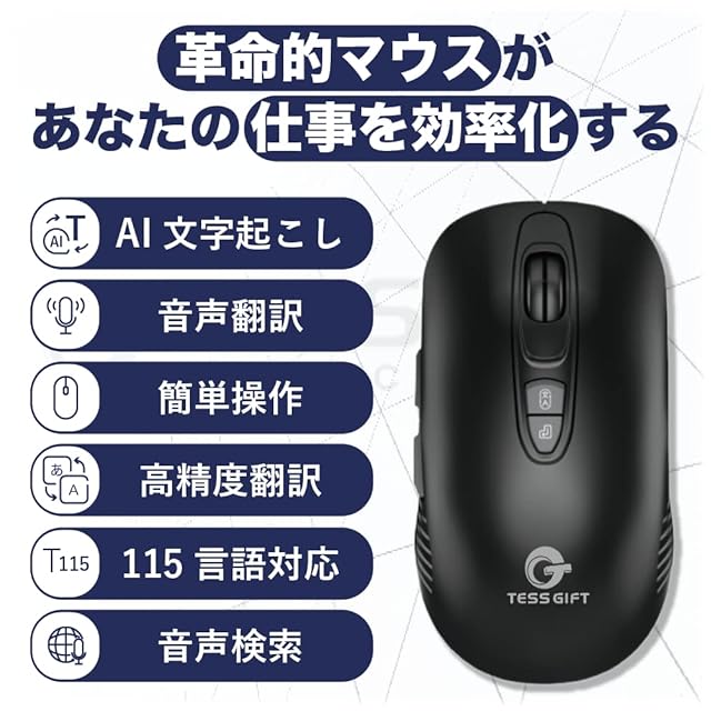 TESS GIFT AI 音声翻訳 文字起こしマウス 文字起こし 音声検索 115言語翻訳 タイピング 多言語対応音声翻訳機 翻訳タイピング (ブラック)