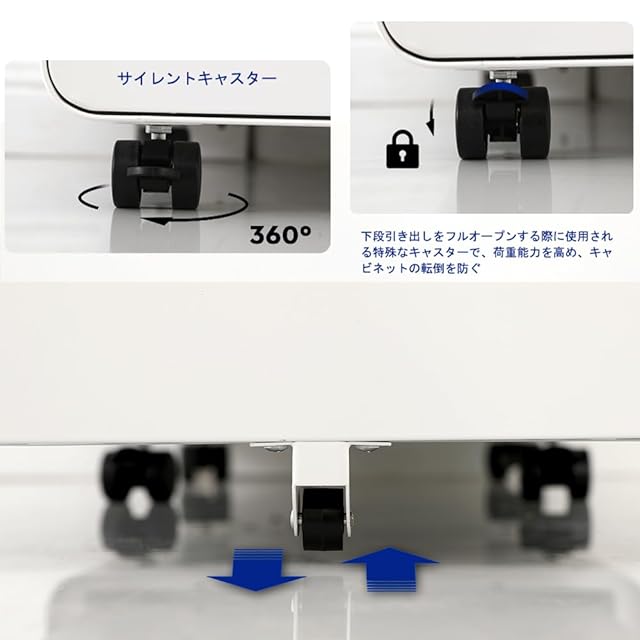 【デスクワゴン キャスター付き】キャスター4 つと下段引き出しをサポートする小さなキャスター1つが底面にあります。この補助キャスターは下段引き出しの開閉時に使用される特殊なキャスターで、耐荷重を高め、キャビネットの転倒を防ぎ、移動がより便利になります。サイドワゴン キャスター付き キャスターは行き止まりなしで 360 度回転でき、キャビネットの移動が楽で、床を損傷することがなく、ストッパー付きで、より安定的にストップしたりできます