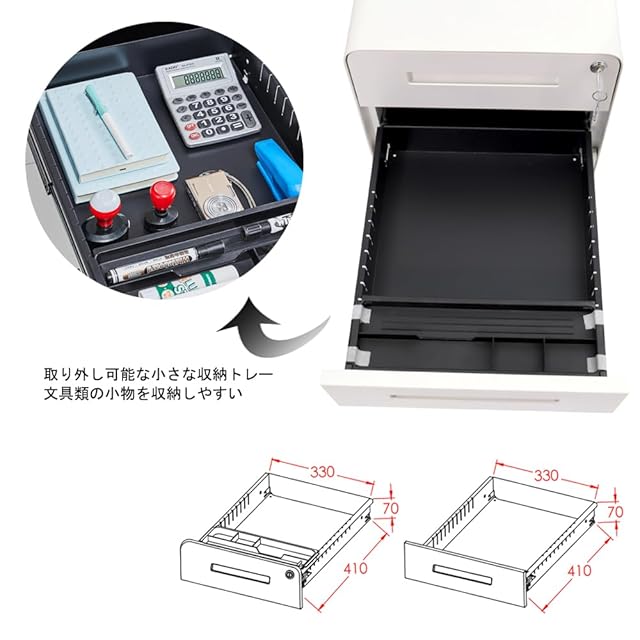 【デスク下収納 3 段オールロックキャビネット】デスク下スペースを有効活用する 3 段引き出しタイプのキャビネットで、全段オールロック仕様に加え、それぞれの引出しに特化した収納機能を備えています。 上段:取り外し可能なペントレー付きで、筆記具や小物を瞬時に手に取れるよう整理整頓。 下段:A4 ファイル収納専用スペースに仕切り板付属。「楽に分類」「効率的に整理」が可能で、大量の文書もスッキリ収納できます。