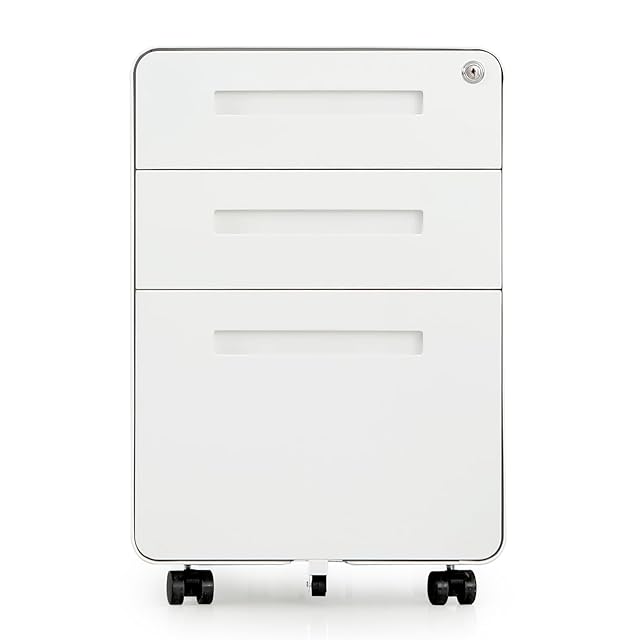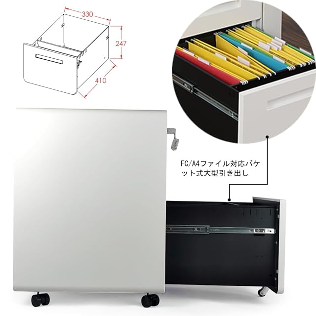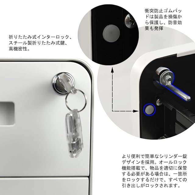 【デスクした収納 ワゴン 鍵付きキャビネット】オールロックシリンダー錠デザインを採用、鍵を何本も保存する必要ななく、1本で十分です。鍵をかければ、3段引き出しがすべてロックされますので、とても簡単で効率よく使えます 3 段大容量収納:全段にスチール製サイレントスライドレールを採用し、滑らかな開閉で音を立てません。
