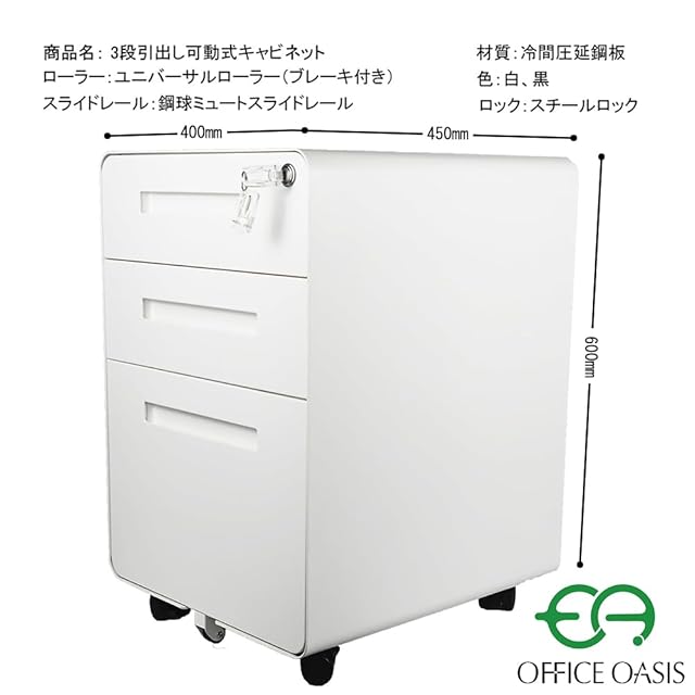 OFFICE OASIS 法人様向け デスクワゴン キャスター付き 3段 デスク ワゴン 袖机 脇机 鍵付き キャビネット デスク下 デスクサイド収納 組立て不要 大容量 丈夫なスチール製 サビ止め塗装 ホワイト 幅400*奥行450*高さ600mm(OA_03D)