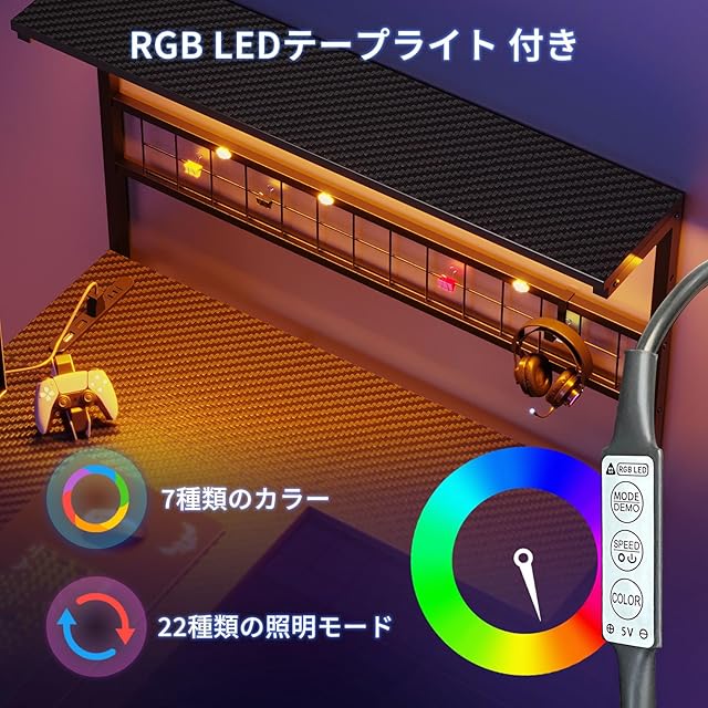 【LEDライト付きゲーミングデスク・ゲームと仕事両立】このゲーミング机にはRGB LEDライトが搭載されており、20種類のモードと7つのカラーを自由に選べます。自分だけのゲーム環境を作り出し、仕事の合間にもリフレッシュできます。