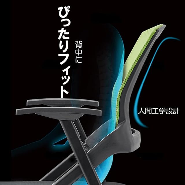 【背もたれはメッシュ素材】背もたれ部分はメッシュ素材で通気性とクッション性を兼ね備え、形状も人間工学に基づいた反りを実現し長時間座っても快適に座れます。