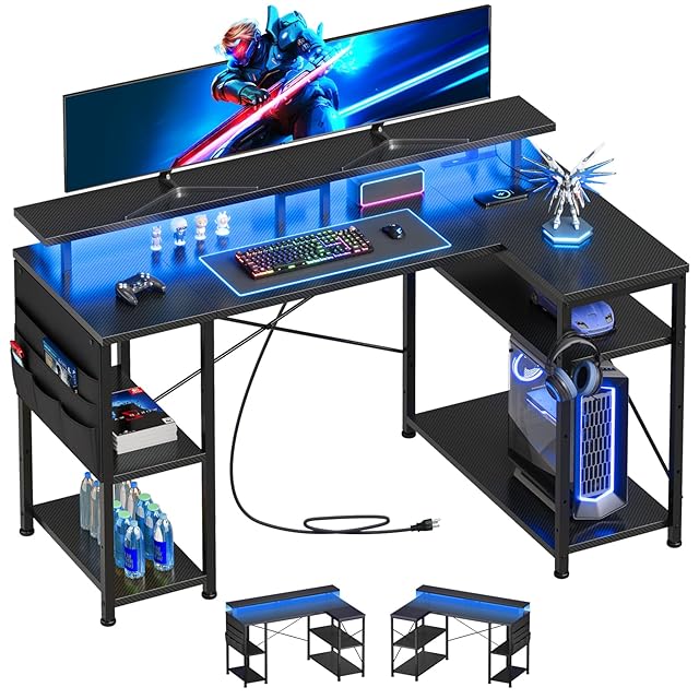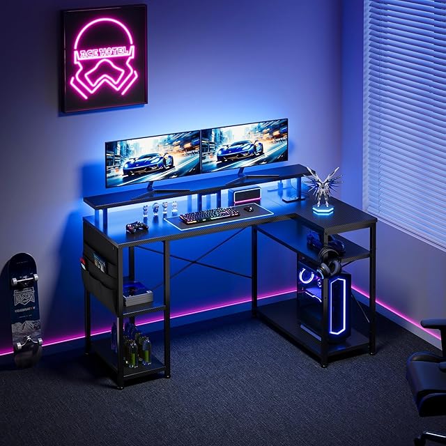 YeTom ゲーミングデスク幅130cm l字デスク LEDライト付き pcデスクコーナーデスク 棚板高さ調節可能 収納袋付き L字型 PC 勉強机 作業 在宅勤務 ゲーム 書斎黒い