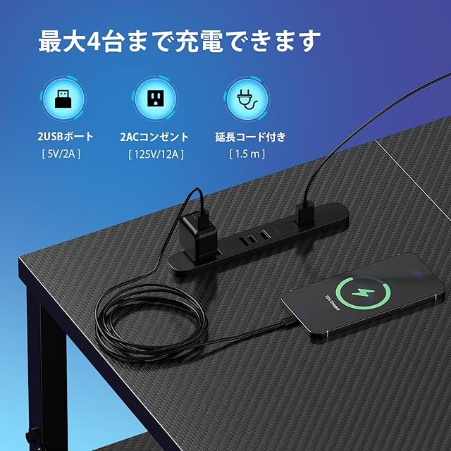 【コンセントとLEDライトのデザインです】 マルチなLEDライトは7つのベースカラー、30種類の照明モードがあり、タイマー機能も備えているので、リモコンやスマートフォンのアプリで操作することができます。また、このデスクにはUSBジャックが2つ、ACジャックが2つ付いており、携帯電話やパソコンなどのデジタル機器を充電することができます。とても人間的なデザインです