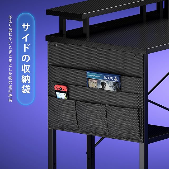 【サイド収納袋です】 この机の側面には、本、ペン、ゲームパッド、イヤホンなどの身の回りの小物を収納できる収納袋が付いており、机の上がすっきりし、オフィス環境が快適になります。