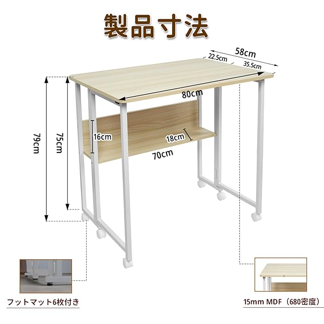 ✅【商品仕様】:折りたたみ机、展開時約幅80×奥行58×高さ75cm、折り畳み時約幅80×奥行22.5×高さ75cm。(高さ表記:キャスターの高さを除く:75cm、キャスターを含む高さ:79cm)。折りたたみ 机、広げると幅80×奥行58cm、厚みは15mmのパソコンデスクになります。 パソコンや書類、タブレットなどを収納するのに十分なスペースがあり、デスク 折り畳みでの作業がより快適になります。折りたたみデスク、折りたたむとコンパクトなサイドテーブルとして使用でき、限られたスペースを大幅に節約できます。