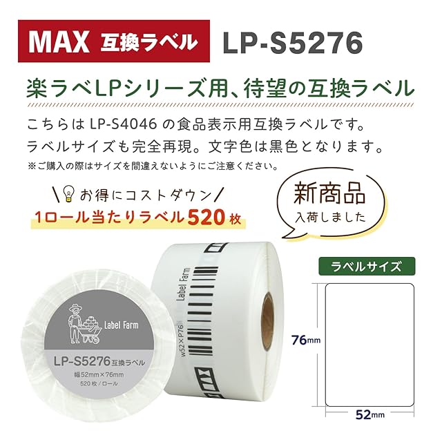 【ラベルファーム】LP-S5276 マックス 互換食品表示ラベル52mm x 76mm 楽ラベ LPシリーズ (10ロール)