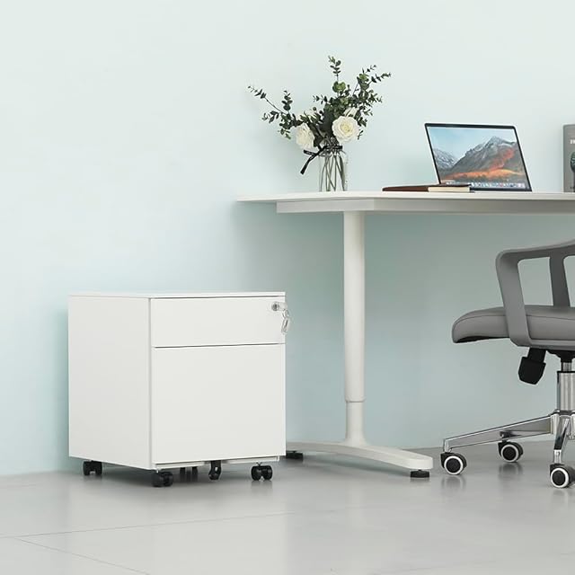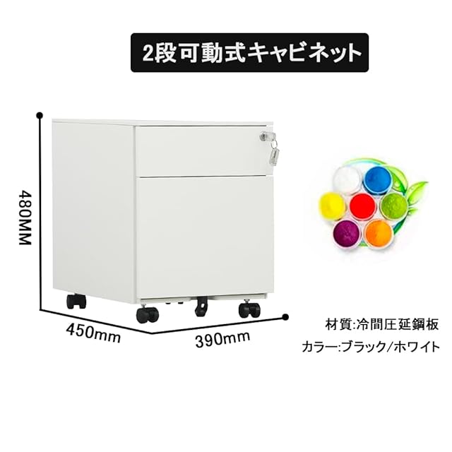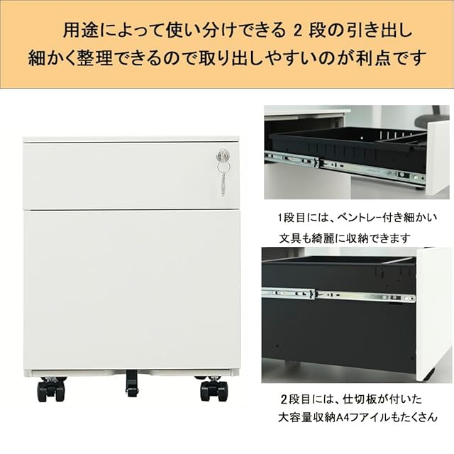 KuraFurni デスクワゴン サイドワゴン 2段 袖机 幅390*奥行450*高さ480mm オールロック キャスター付き 鍵付き A4対応 丈夫なスチール製 組立て不要(MA-02-A)