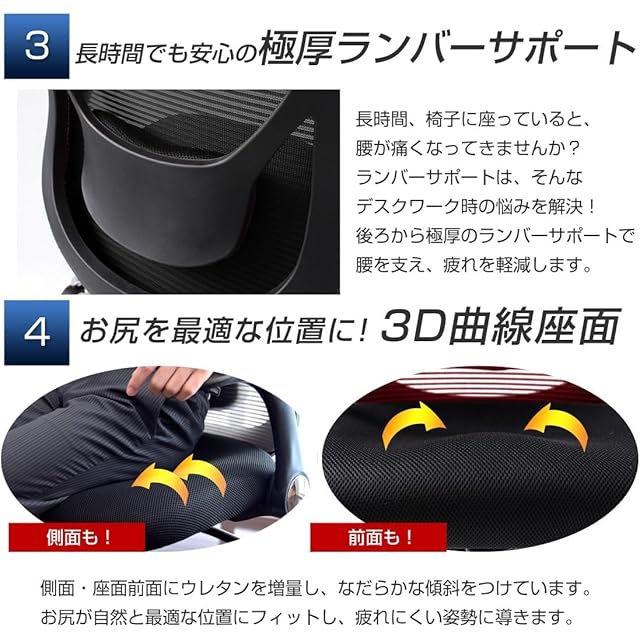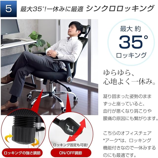 長時間のデスクワークを支える機能を多数搭載!腰を支えるランバーサポートやロッキング機能、高さ調節可能なヘッドレスト付きです。肘掛けを自由に動かせるロータリーアームを採用しているので用途に応じて使い分けが可能です。