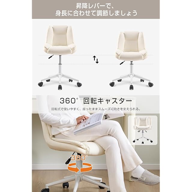 【360°回転するシート、高さ調節可能な勉強椅子、TPR静音ホイール付き、事務も休憩もご自由に】360°回転し、約10cmの範囲で任意の高さに調節可能です。テーブルの大きさや形に合わせて、いつでも適切な高さと角度に調整できます。デスクであれ、パソコンデスクであれ、あるいはブックテーブルであれ、座り心地の良いこのいすは、体を優しく受け止め、寄り添ってくれますように。シンプルでゆったりとしたので、リビングルーム、寝室、図書館、オフィス、ホテルなど、屋内のあらゆるシーンにマッチします。