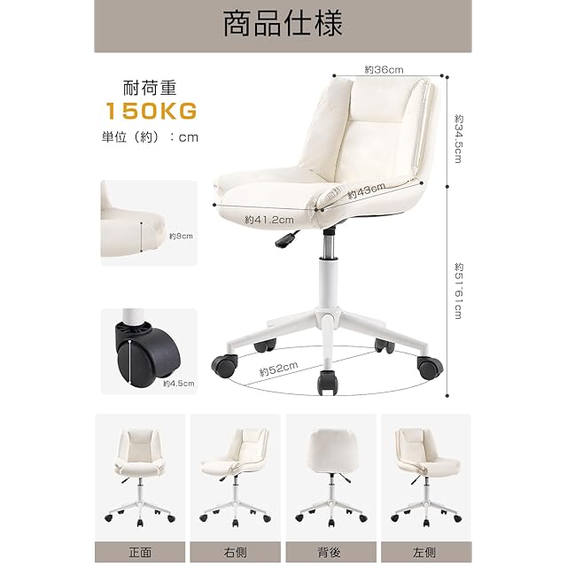 【組立簡単なデスクワークチェア&商品仕様】オフィスチェアの寸法:幅:41.2cm、奥:43cm、椅子の高さ:75-86cm。座面高さ:51-61cm。約10cm上下昇降機能ができて、身長に応じて調整できます。デスクチェアの重量は6.7KGで、耐荷重が約150KGです。材質(座面):張地/PUレザー。材質(クッション材):ウレタンフォーム。材質(脚部):スチール。また、利便性のための組み立て道具・日本語説明書・補足部品もついています。誰でも5分ぐらいで一体成型チェアを組み立てられます。※チェアの上部は少し重いです。予めご了承くださいませ。
