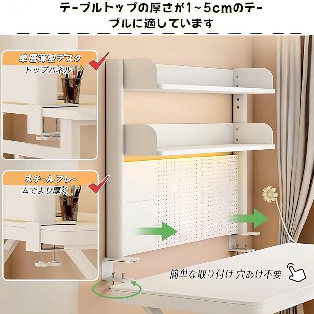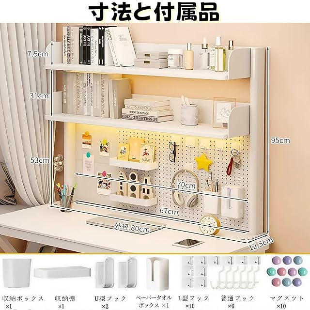 【有孔ボード設計】この机上ラックの大きな特徴は、有孔ボード設計を採用していることです。L字フック、ペンスタンド、ミニコンテナ、マグネットクリップ 、自由に有孔ボードに取り付け出来、何回も変更することができます。