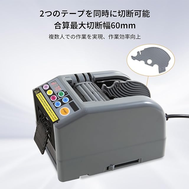 【作業効率の向上】:電動テープカッターは2つのテープを同時に切断できるため、複数人での作業を実現し、作業時間の短縮と作業効率の向上を実現しました。 使用できるテープの最大幅は合算で60mm以下。