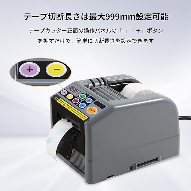 【自動/手動モード】:電動テープカッターには自動モードと手動モードがあり、ボタンを押すだけで切り替わります。自動モードでは、最大999mm設定可能の長さが設定されると、必要な長さのテープを自動的に切断して送り続けます。