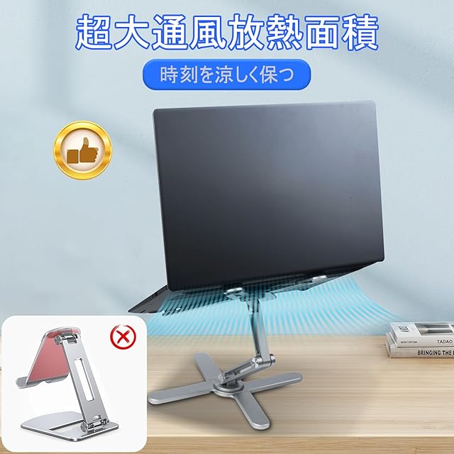 [究極の放熱性能]独特なX型デザインは、まるで夏の暑さを吹き飛ばす風のように、デバイスの熱を効果的に排出します。この進化したパソコンスタンドのデザインは、長時間の使用にも耐え、デバイスの寿命を守ります。