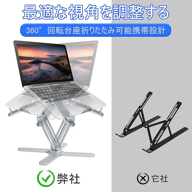 [自在な高さと角度調整]このパソコンスタンドは、あなたの望むままに高さと角度を自由に調整できます。成人女性でも簡単に操作できるほど軽い力で調整可能。使わないときはコンパクトに折りたたみ、バッグにすっぽりと収まります。出先でも、自宅でも、どこでも快適に使用でき、常に最適な視点でノートパソコンスタンドとして作業を続けられます。